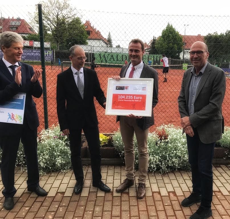 Der ETC hat am vergangenen Dienstag über 100.000 € vom Thüringer Landessportbund aus den Händen des Geschäftsführers Thomas Zirkel zur Sanierung der Tennisanlage erhalten. Zuvor übergab Sportminister Helmut Holter dem LSB die für den Sportstättenbau vorgesehenen Landesmittel. Wir freuen uns, dass gerade unserer Sport auf diese Weise eine sehr hohe Wertschätzung erfährt. Ein besonderer Dank geht an alle Unterstützer, insbesondere an unseren Vizepräsidenten Eckhard Stassen.