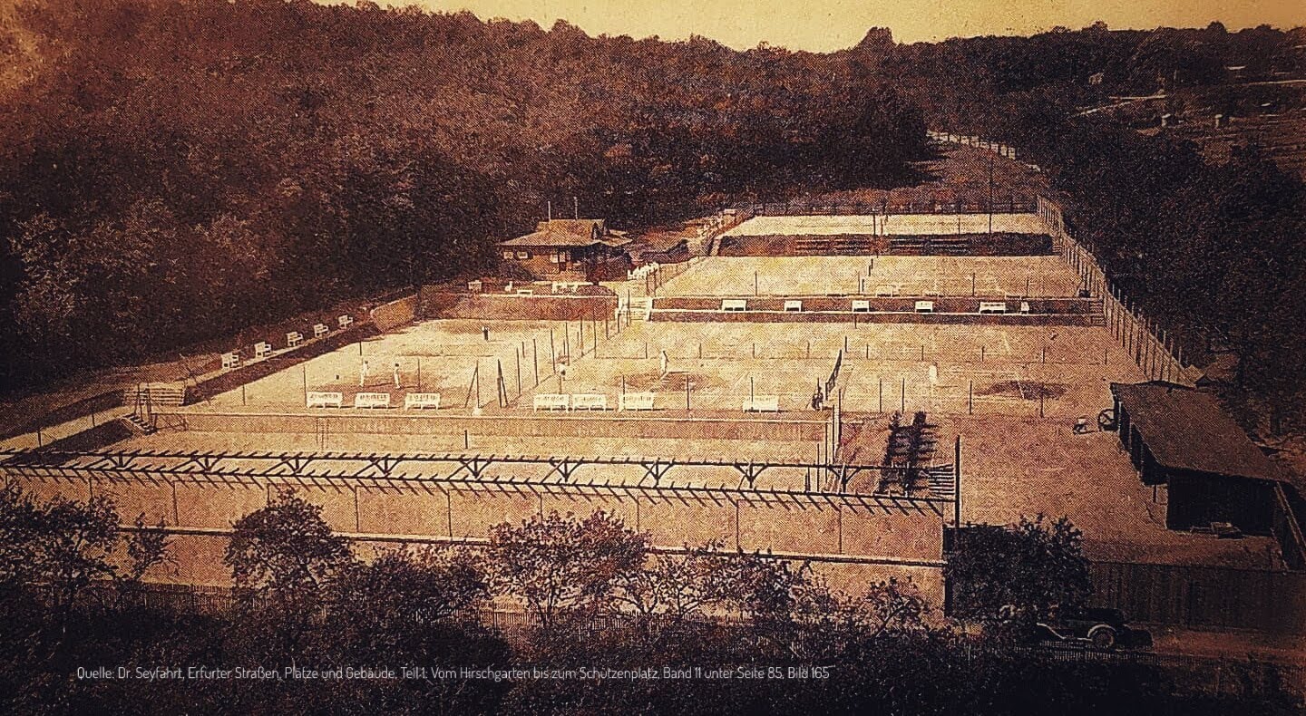 Wir danken Dr. Seyfahrt aus Erfurt, der uns erlaubt, dieses wohl bald um die 100 Jahre alte Foto (geschätzt um 1925) offiziell zu verwenden. Es ist zu finden in seinem Bildband „Erfurter Straßen, Plätze und Gebäude,“ und dort im Teil 1: Vom Hirschgarten bis zum Schützenplatz, Band II unter Seite 85, Bild 165. Damit gratuliert er uns zugleich zur Wiederherstellung von nunmehr ebenfalls 8 Plätzen. Wer genau hinschaut, kann manch interessantes Detail entdecken.  Im Übrigen hat er bei uns in den 1950er Jahren den Schläger geschwungen.