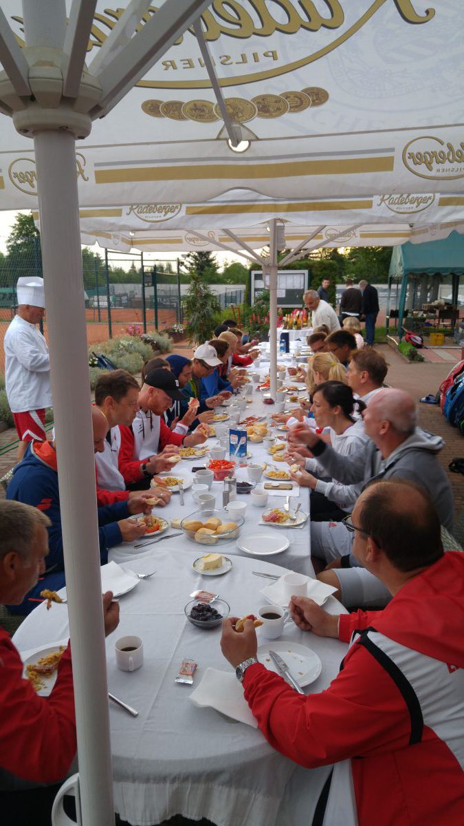 Hoch zufrieden ist Organisator Roland Bockelmann mit dem Verlauf seines erstmalig vor 10 Jahren ins Leben gerufenen Frühaufsteherturniers. Zum Jubiläum am vergangenen Samstag fanden sich dann auch 30 Frühsportler ein, unter ihnen Gründungsteilnehmer und viele Neulinge. Auch bisher eher seltene Phänomene gab es mit der Teilnahme von nicht wenigen unserer Jugendlichen der U-18 Mannschaften, die wohl erstmals in ihrem Leben ab 6 Uhr Tennis spielten. Wie immer gab es leckeres Frühstück und viel Spaß bei den Doppeln. Diesmal wollen wir besonders den jungen Unterstützern Johann, Boris mit Freundin Madleen, Johannes sowie der Familie Maurer recht herzlich danken, die zu früher Morgenstunde im Helferteam um Bockel und Evi alles bestens vorbereiteten.