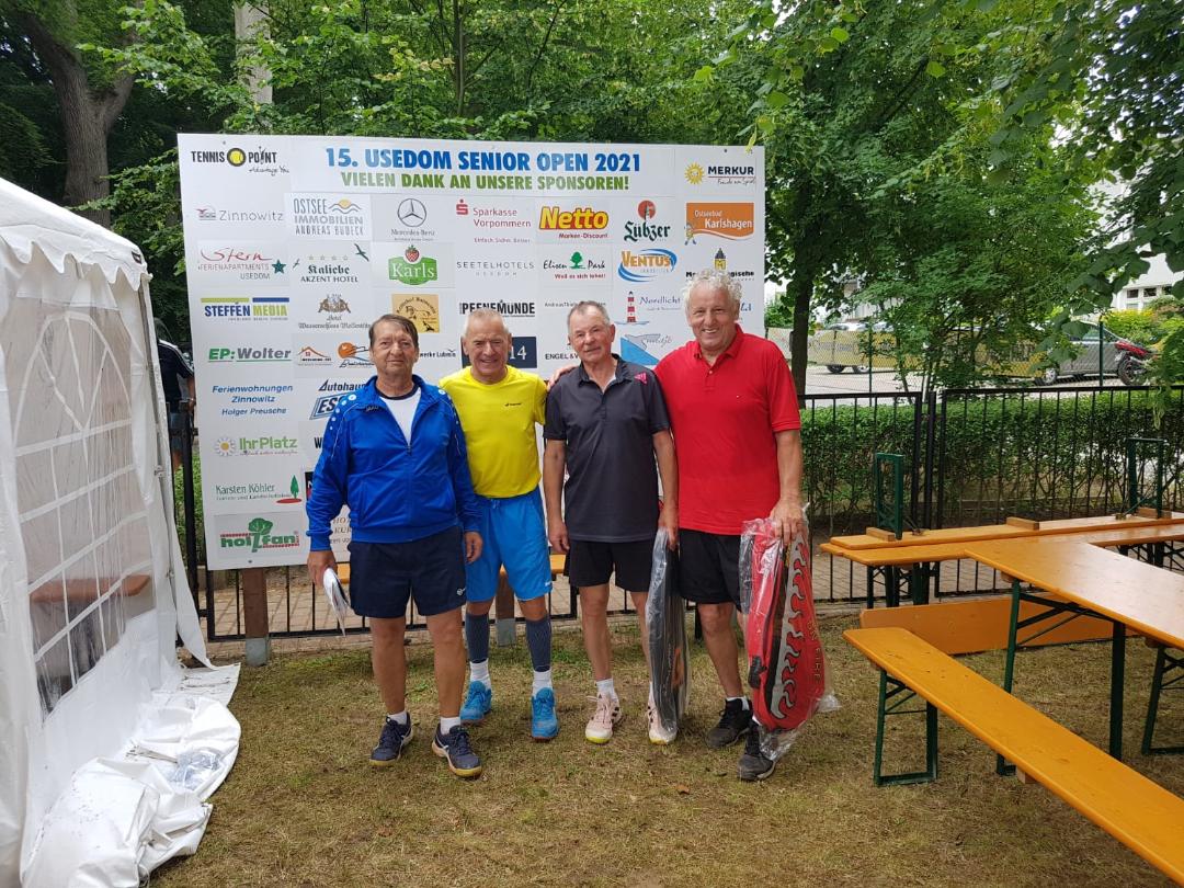 Großartiger Erfolg für unsere Rot-Weiß-Senioren: Wolfgang Benkert (im Bild ganz rechts)und Walter Leinhos (daneben, Bild Molli) haben überraschend die Doppelkonkurrenz der Herren 70 bei den 15. Usedom Senior Open in Zinnowitz gewonnen. Im Finale setzten sie sich gegen die an Nummer eins gesetzten und favorisierten deutschen Ranglistenspieler Claus Peter Gutsche/Reinhard Lehmann (im Bild von links) aus Ludwigsfelde/Berlin mit 3:6, 6:3, 10:8 durch. Im Damendoppel 55+ erkämpfte sich Britta Otte mit ihrer Partnerin Karin Gaudigs (Suderwich) den zweiten Platz. Erst im Finale mussten sie sich dem favorisierten Doppel Karin Reinhard/Christine Kämmerer (Berlin) mit 3:6, 2:6 geschlagen geben. Auch Moni und Bockel spielt sich erfolgreich durch die stark besetzten Hauptfeldrunden. Wir gratulieren recht herzlich (Text: Buma).